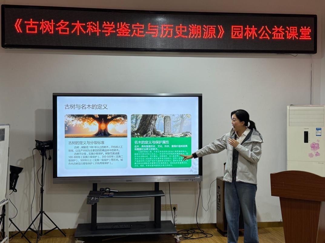 3月30日下午,培训在金山公园抚山居会议室举行。活动由金山公园管理处高级工程师邹润玲授课,围绕古树名木保护法规与政策、基本概念与价值、树龄鉴定方法以及智能识别技术应用等内容进行系统讲解。