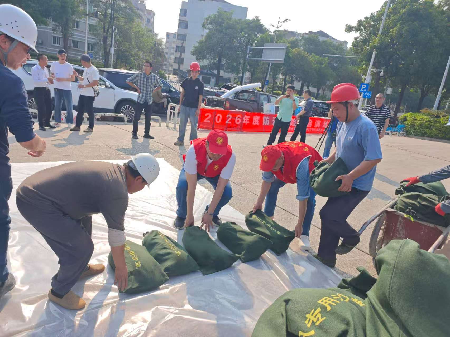 其次,物资后勤保障组快速将沙袋、土工布、木桩等物资运抵作业区;技术指导组现场测定标高,明确子堤尺寸标准;安全保障组落实防护措施、划定危险区域;应急抢险组规范铺设土工布、交错堆叠沙袋并层层压,快速筑成符合挡洪要求的临时子堤 。