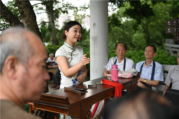 三伏过后天气逐渐凉爽,应广大观众要求,结合天气及实际演出情况,“福州评话”白塔书场的演出时间调整为每周六上午8:30-9:30。9月5日是第一次更改时间,虽然有部分人不适应,但还是吸引了很多观众。此次白塔书场,表演艺术家陈燕彬老师为大家带来福州评话《八珍楼》,伴随着老师的一举一动,观众的心也被牵动,虽然只有短短的一个小时,但老师的生动表演还是让许多人沉浸故事中,久久不能自拔。